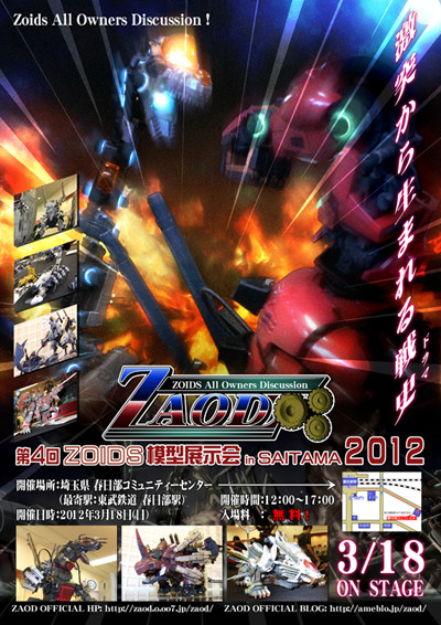 2012年3月18日(日)、第4回を迎えるZAOD展示会が、埼玉県春日部市 春日部コミュニティーセンターで行われました。 当日は200近い数のゾイドが集結。様々な表現ゾイドがそこにありました。 当日は小雨でしたが、足元の悪い中、多くの方にお越し頂き、展示会は大成功となりました。 御礼を申し上げます。