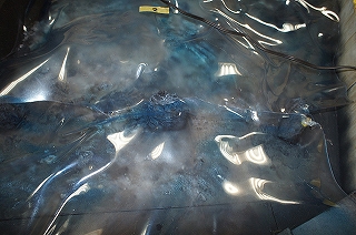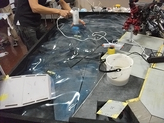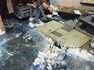 海面パーツが重なる部分をプラ板用ハサミで切り取って違和感がないように・・・メンバー全員が驚いていましたが、時間経過で僅かながら形状が変わったということが!家庭用ドライヤーをあてて形状修正調整し、帳じりを合わせました。おそらく展示会当日も、形状が微妙に変わるだろうなぁ・・と全員の共通認識でした(汗)