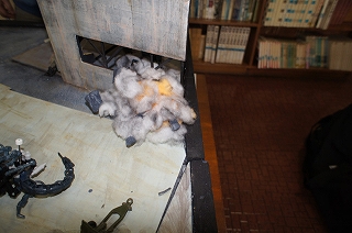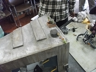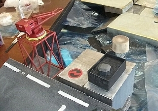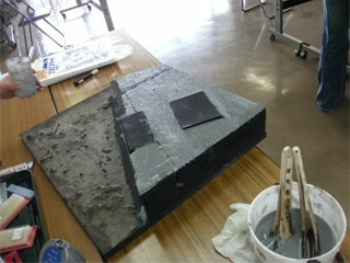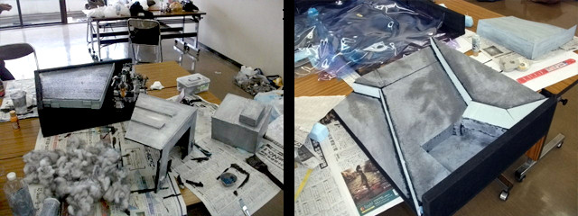 制作ミーティング終盤に『第3回ZAOD展示会』で展示した市街地ジオラマの補修及び欠損部分の工作を行いました。貼りつけたシートの剥がれや欠け部分がいくつかあったのでした。このジオラマは『第4回展示会』で、撮影場所として設置を行いました。