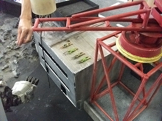 薄い塩ビ板を電熱器で曲げた波表現パーツの形状調整。要らない部分はハサミで、ばっさりカットしていきます。