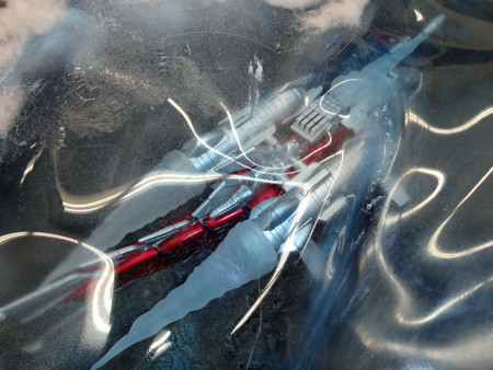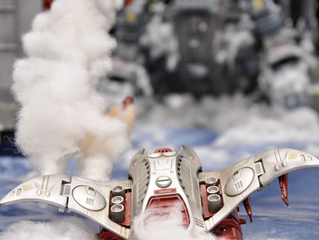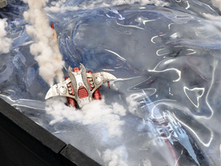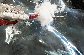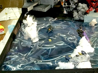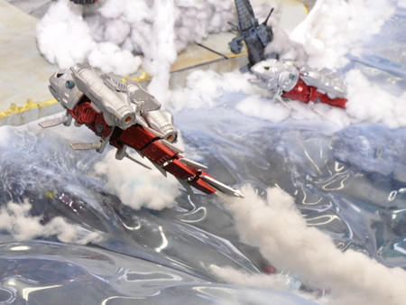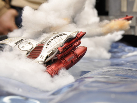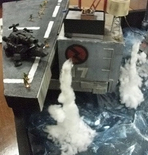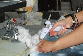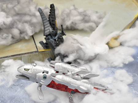 爆発エフェクトや海水飛沫エフェクトを、綿で表現しました。グル―ガンで接着した後、綿を軽く引っ張ってみたり、盛り付けなど所々に変化を与えることで、爆発による発生した水柱や飛沫を上手く表現できたのではないでしょうか。