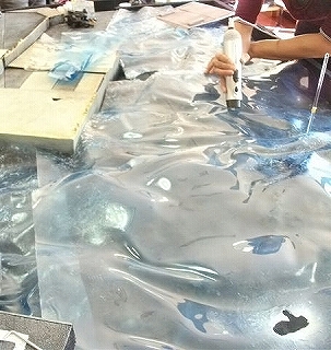第4回のミーティングで塗布した透明樹脂『ジェルメディウム』部分に、白の塗料(缶スプレー/ビン塗料)によるドライブラシを行いました。これは波が行った時に見える白の部分です。