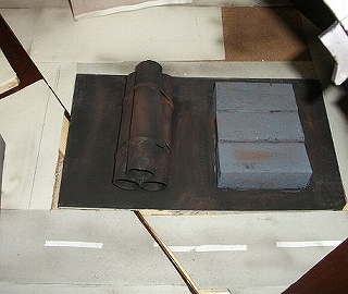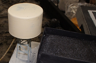 その場にあった切り出したスタイロフォーム端材やロール紙の芯で『資材置き場』を作ってみました。『ジェッソ塗料』で塗装したあと、汚し塗装を行いました。この汚し塗装で使った物は『パステル』というものです。