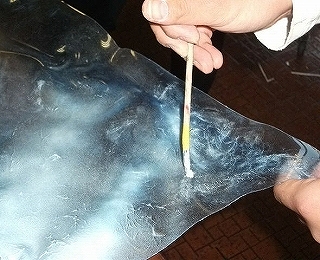 ジェルメディウムは塗布時には白っぽいですが、乾燥すると透明になるのでそのままでは『波』には見えず、盛りあがった部分も分らないと思います。なので白の塗料を塗って、毛先を短くした筆に溶剤を含ませて、軽く叩いて白の塗料部分を溶かしていきます。溶かした部分の薄い部分や濃い部分の割合をランダムにしていきます。