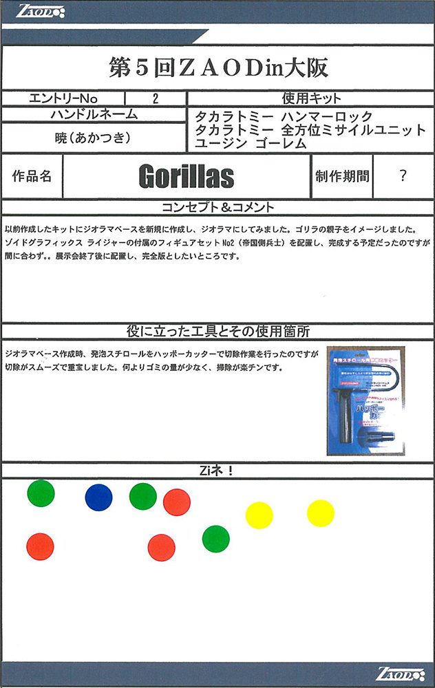 ◆作品 Thanks to everyone for all ◆プロフィールシート ◆エントリーシート ◆アンケートに寄せられたコメント Gorillas:ハンマーロックもそうですが、特にゴーレムの塗装は見事としか言いようがありません。小ささを感じさせないです。:男(29)