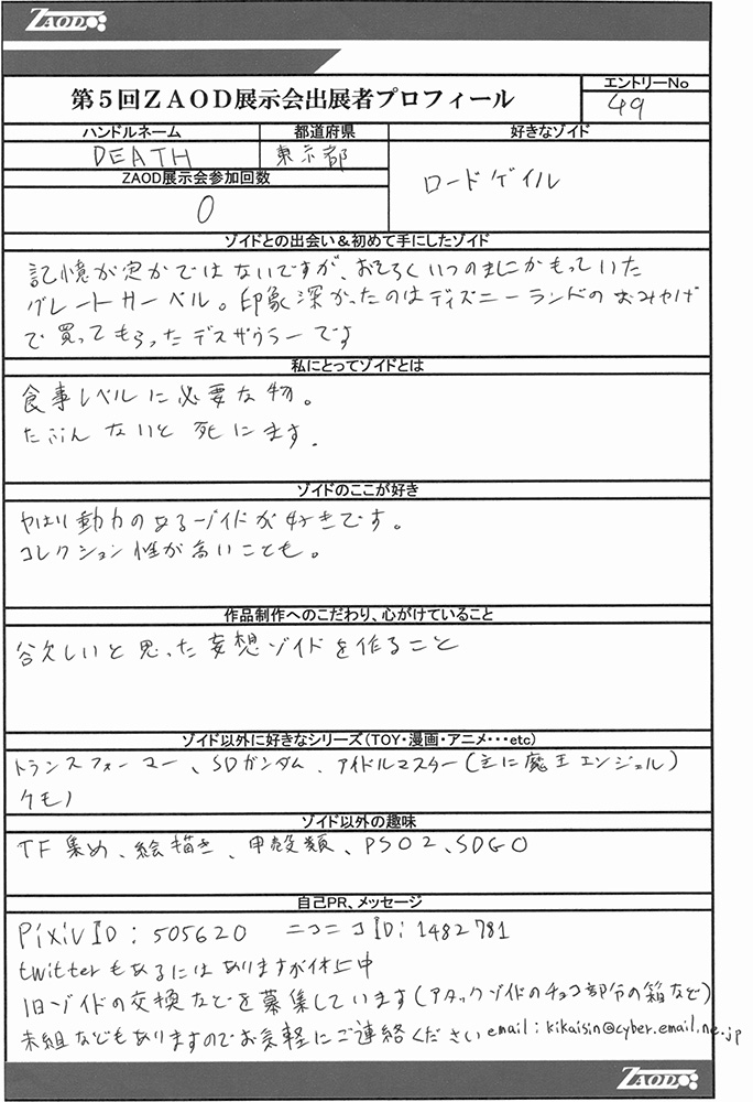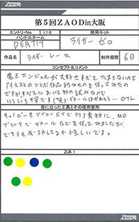 ◆作品 Thanks to everyone for all ◆プロフィールシート ◆エントリーシート ◆アンケートに寄せられたコメント ライガーレーヌ:何と言おうとそのカッコ良さ。ある種の悪を連想させる黒地に紅のカラーリングが凄く好みでした。:男(25)