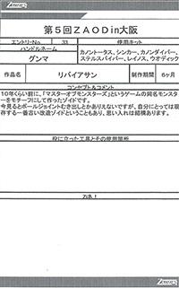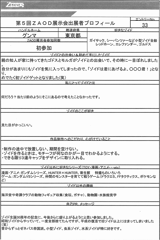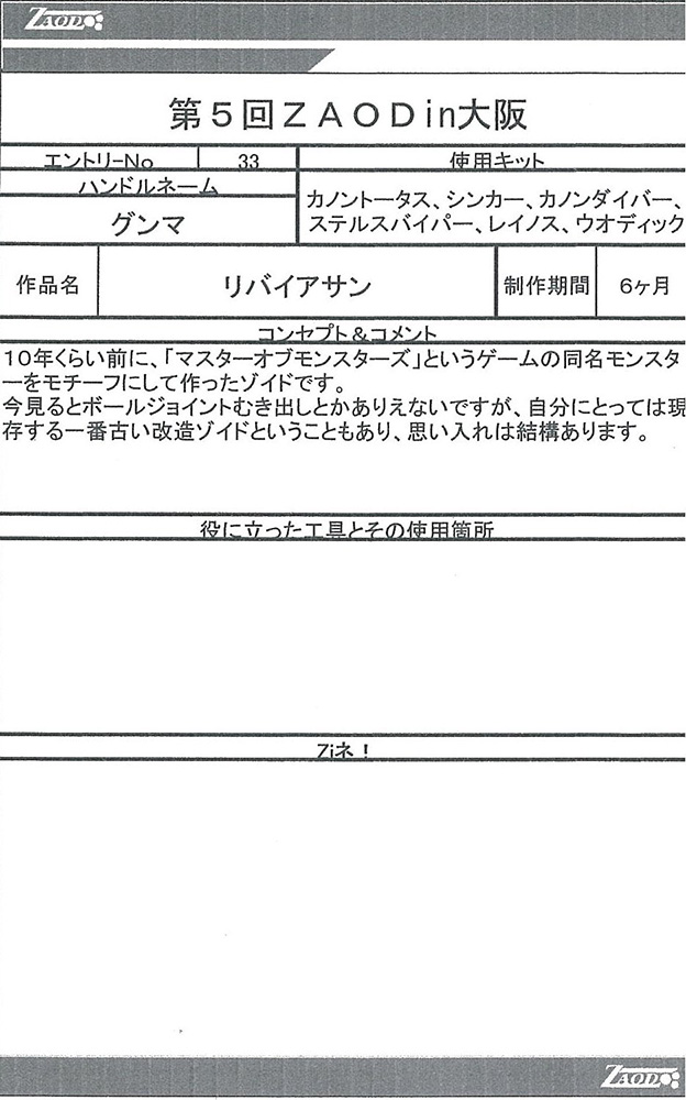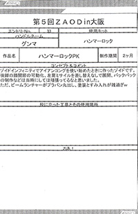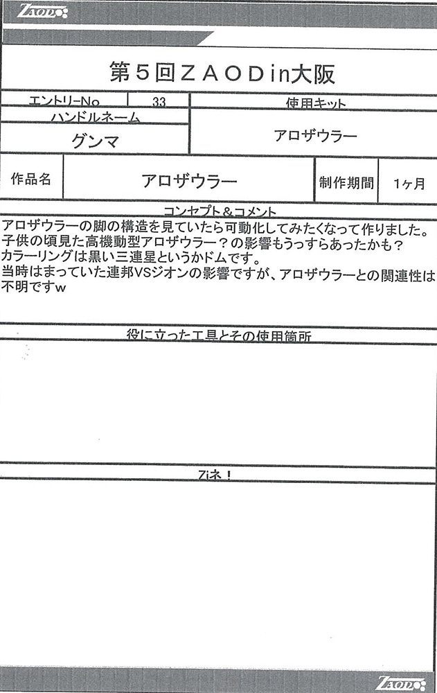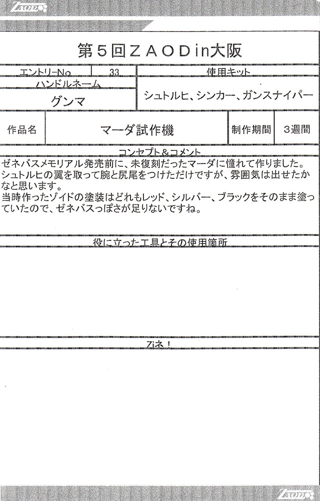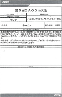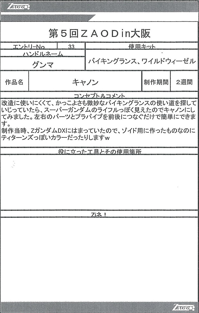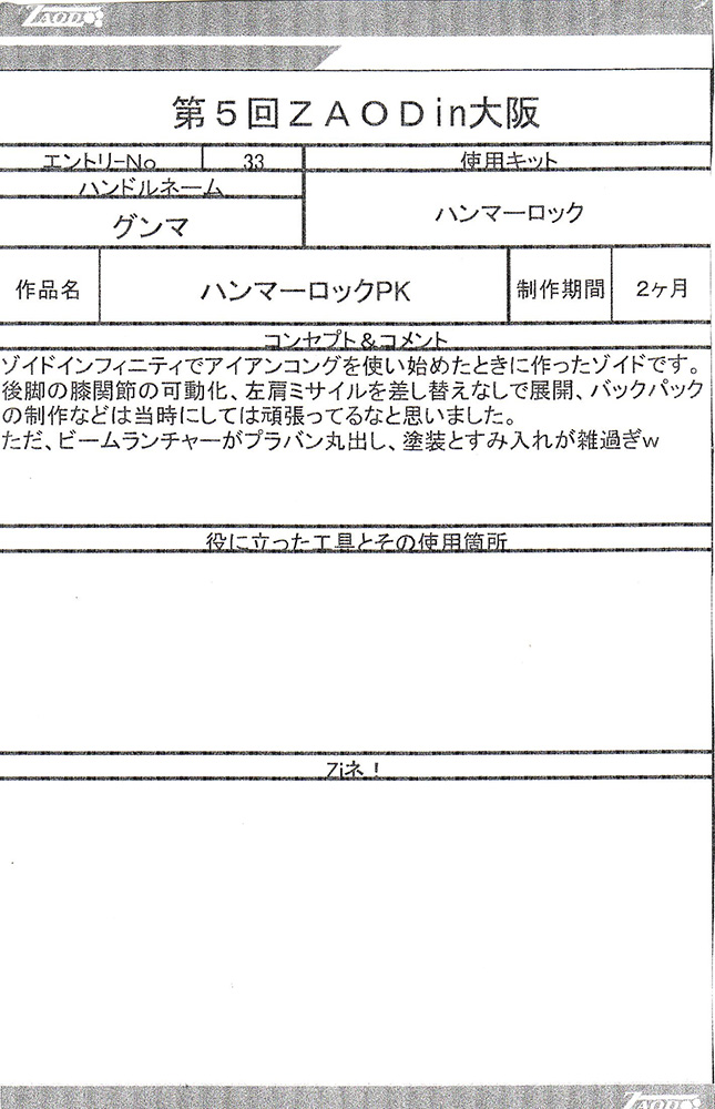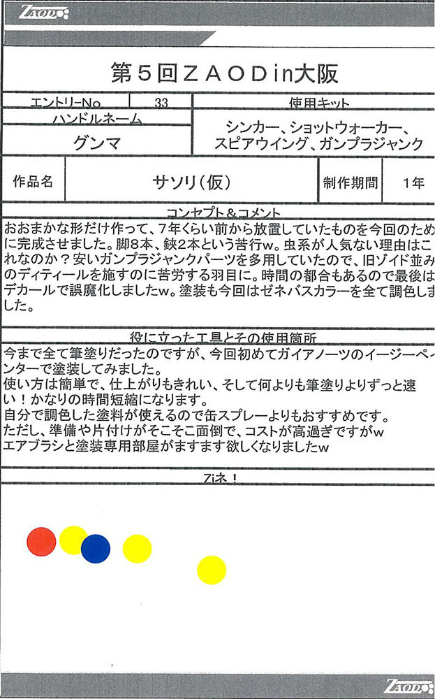 ◆作品 Thanks to everyone for all ◆プロフィールシート ◆エントリーシート ◆アンケートに寄せられたコメント サソリ(仮):実在する商品っぽい完成度だと思います。:男(40) サソリ(仮):シンカーベースなのがまるわかりでも、それがまたよし!全体の統一感がよい。ガンプラパーツを使っているのが一見わからない・:男(34)