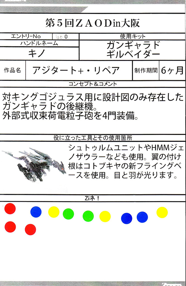 アジタート+・リペア:とにかくかっこいい!初見デスザウラーの改造かと思った。ガン・ギャラドは実際見たことが無かったもので、頭部と実際のカラーリングがカッコいいと感じた理由。背中のブースター(かな?)もいい。:男(19)