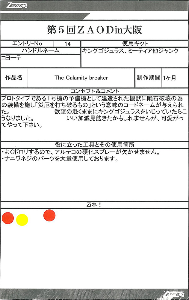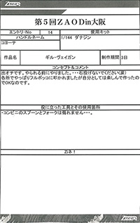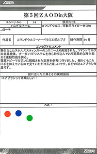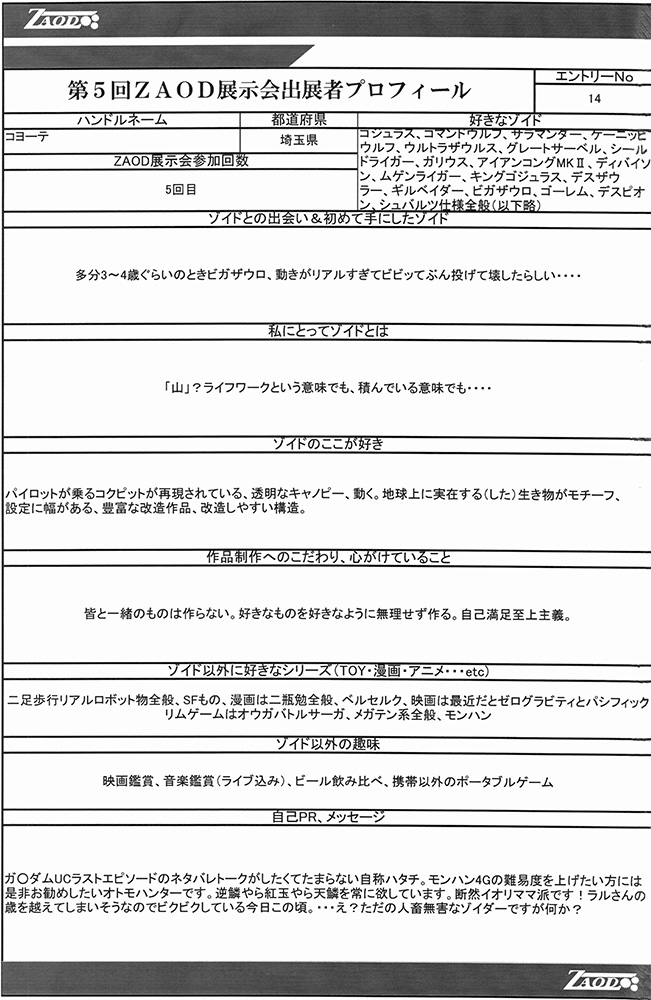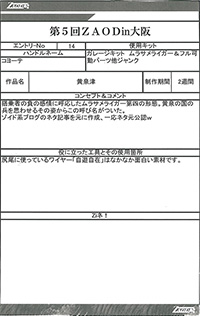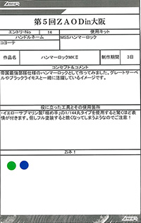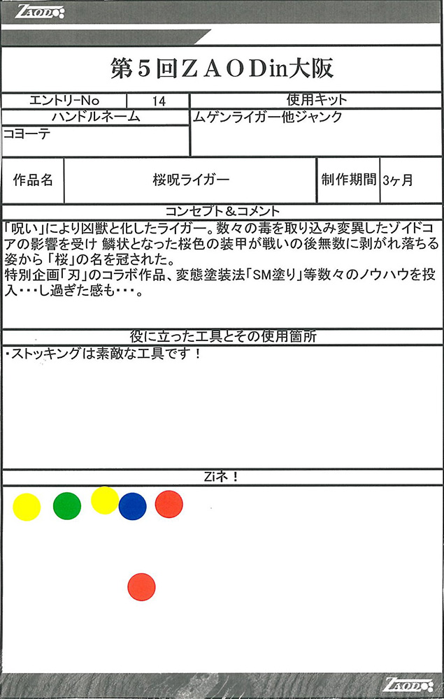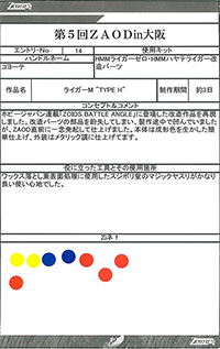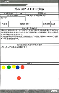 ◆作品 Thanks to everyone for all ◆プロフィールシート ◆エントリーシート ◆アンケートに寄せられたコメント ライガーM”TYPE H”:色がきれい:男(26) ライガーM”TYPE H”:ムラサキ色がかっこよくスッキリとした色合いで良かったです。:男(26) 桜呪ライガー:「呪われた」というおどろおどろしさと桜の美しさが織り混ざった怪作。:男(35)