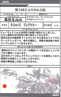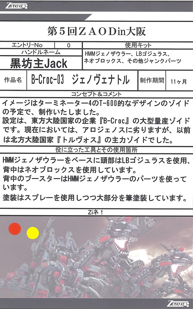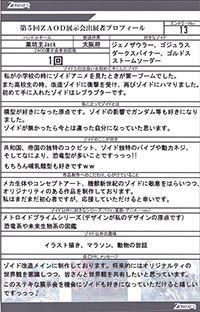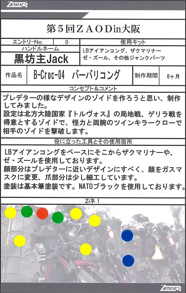 ◆作品 Thanks to everyone for all ◆プロフィールシート ◆エントリーシート ◆アンケートに寄せられたコメント アロジェノス:モデルとなった恐竜の再現度が高いから。:男(25) バーバリコング:かっこいい:男(31) バーバリコング:(コメントなし):男(27) バーバリコング:コングらしさをの残しつつ特殊部隊という印象をありありとうけました。こういうのはミリオタな自分としては大好きです。:男(25) プレデクター:細身のラプター型が好きなのと、カラーリングが好みだから。:男(21)