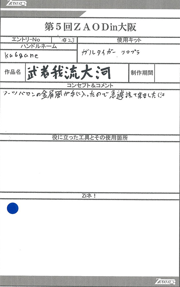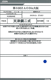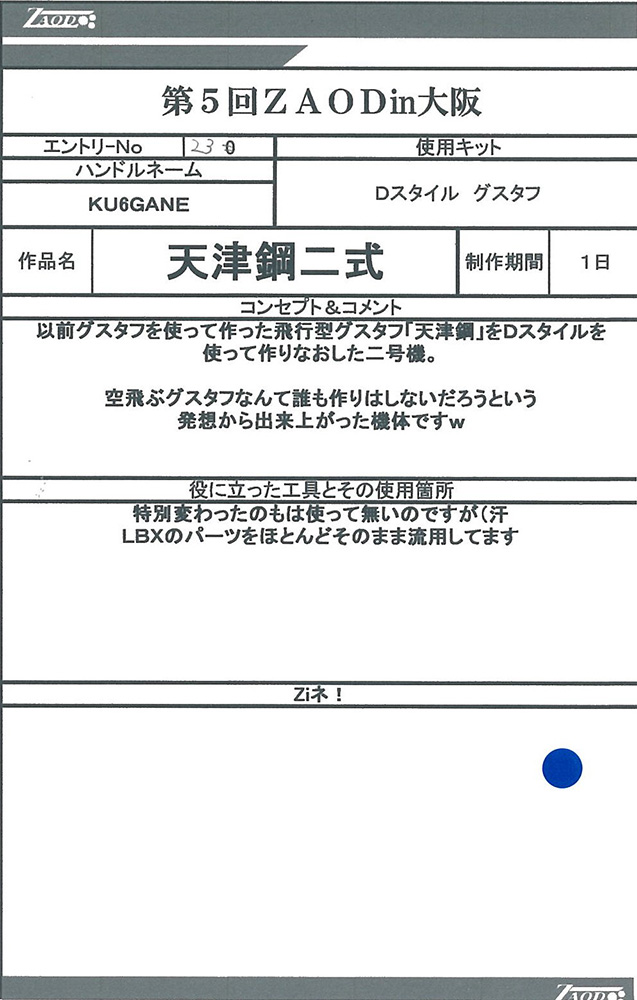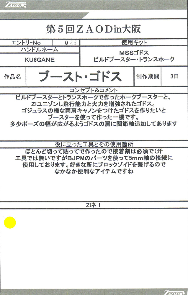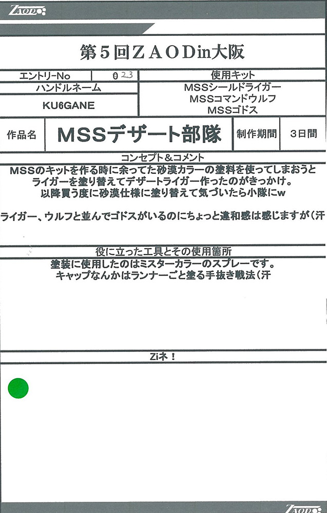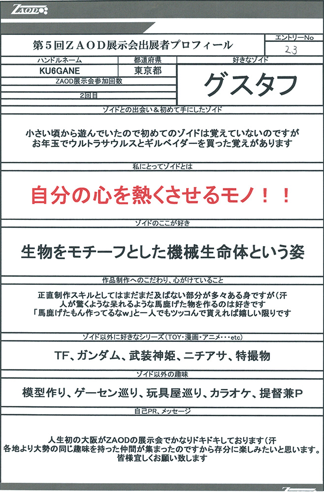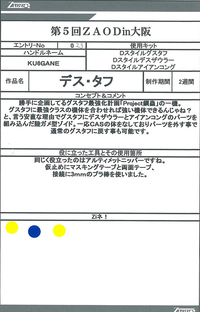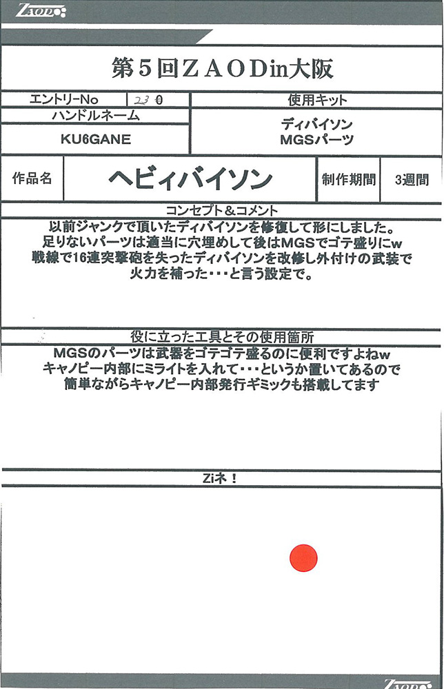 ◆作品 Thanks to everyone for all ◆プロフィールシート ◆エントリーシート ◆アンケートに寄せられたコメント G・スティンガー:ガンプラだけでZOIDSを作るという発想が狂っている(褒め言葉):男(22) G・スティンガー:メカ娘いいよね:男(23) MSSデザート部隊:カラーリングが好みだった:男(19) デス・タフ:発想の勝利!!w:男(26)