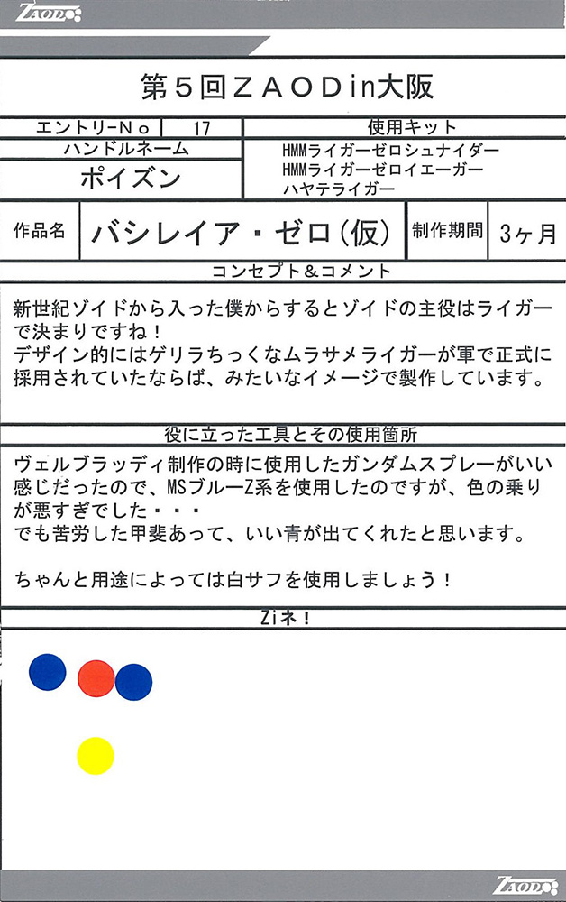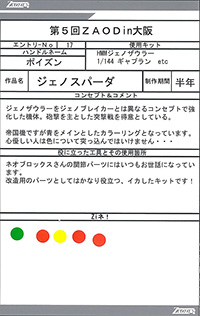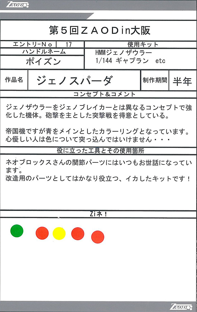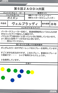 ◆作品 Thanks to everyone for all ◆プロフィールシート ◆エントリーシート ◆アンケートに寄せられたコメント ジェノスパーダ:いかにもな高起動に砲撃強化型ジェノ、昔あれこれ考えたことがありました:男(25) バシレイア・ゼロ(仮):カッコイイ:男(23) ヴェルブラッディ:一番デザインが格好良いと思った。:男(23) ヴェルブラッディ:ジェノブレやデス様のようにやっぱり赤黒の配色はかっこいいです(笑):男(20) ヴェルブラッディ:バーサークフューラーには赤が似合う。:男(25)