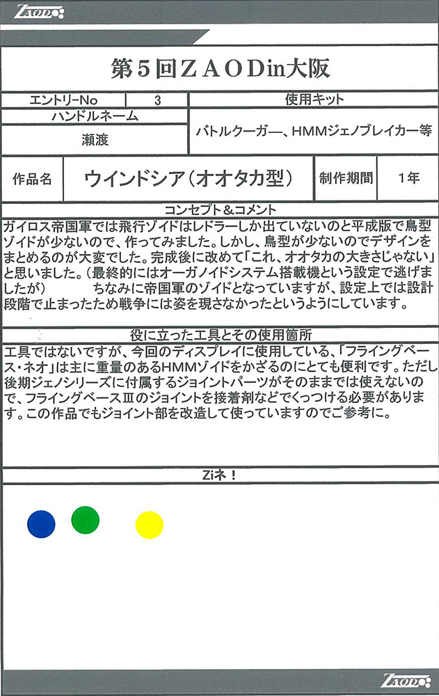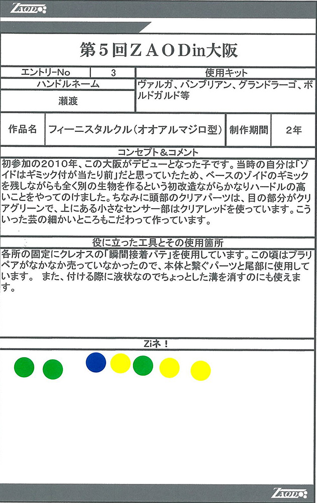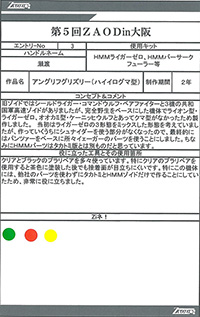 ◆作品 Thanks to everyone for all ◆プロフィールシート ◆エントリーシート ◆アンケートに寄せられたコメント アングリフグリズリー:クマの感じが出ていい。武装もかっこいい:男(32) ウインドシア:(コメントなし):男(32) フィーニスタルクル:可動するのがいいと思いました!ずんぐりしたシルエットがかわいい:女(29)