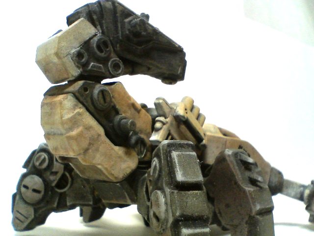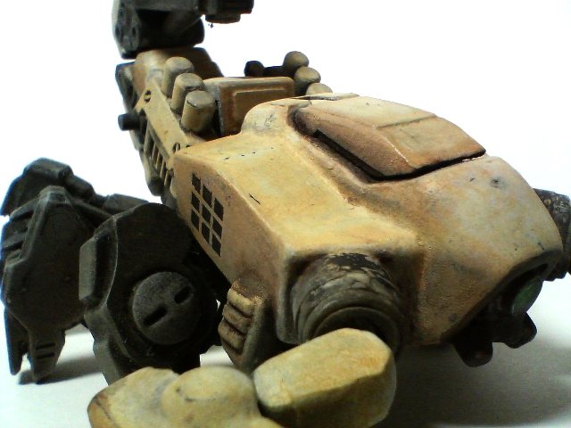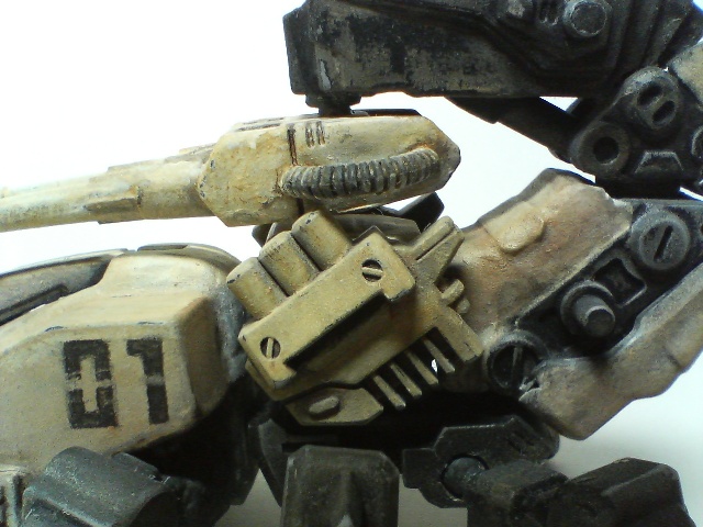 全体にメタリックグレー、装甲部分にホワイト、全体にホワイト+サンドイエローで基本塗装を終え、 ムラが気になる箇所と装甲部分のハイライトをペーパーでこすって仕上げます。