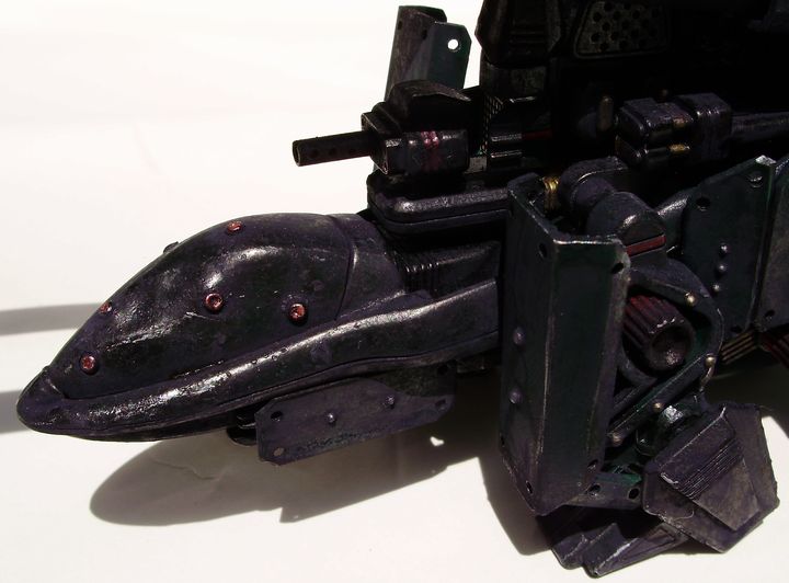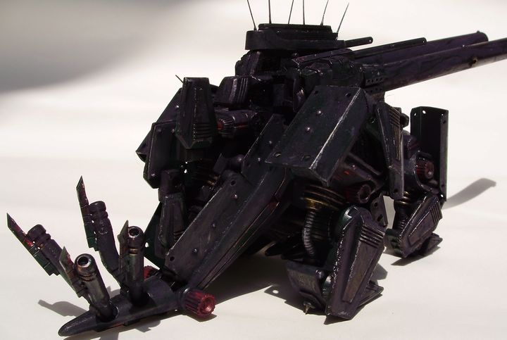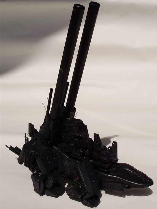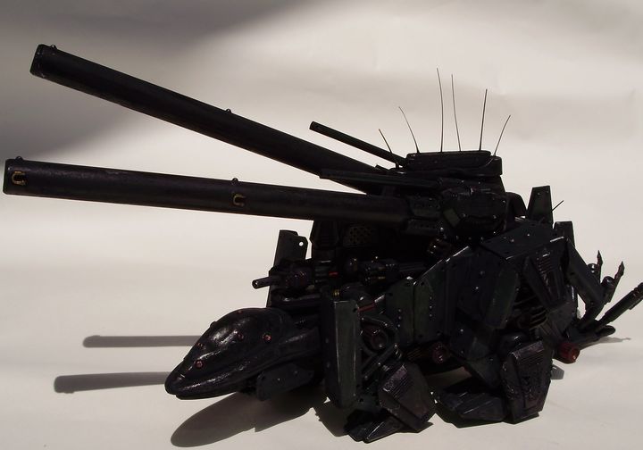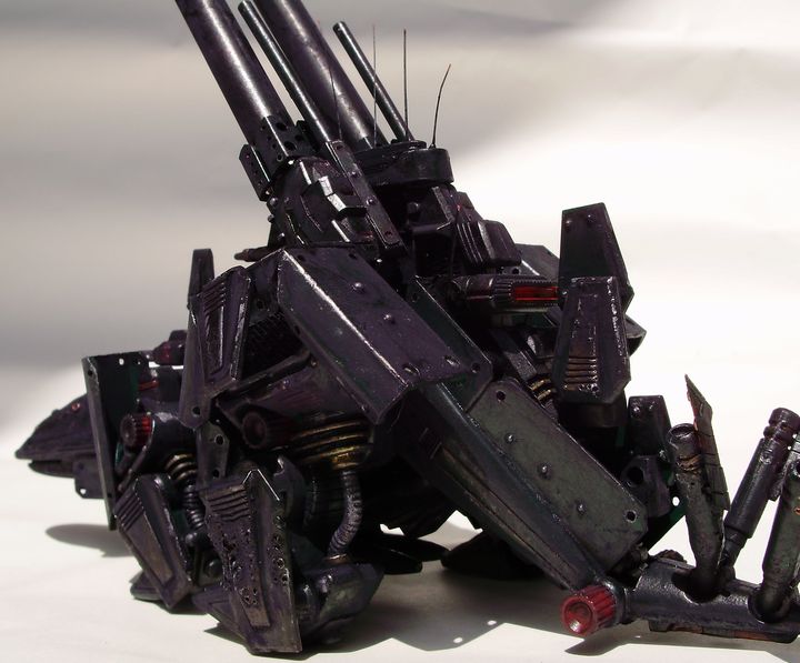 ■ 製作コメント 工作内容 とりあえず、背びれ部分の元パーツを除去してプラ板とメッシュで 冷却機ぽく改造。のちプラパイプとジャンク製の砲塔を乗っけています。 あと、背びれ上部には熱して伸ばしたプラ棒をアンテナレーダーとして追加 脚部は網目部分を開口、後にプラ板とメッシュで造りなおし、プラ板で製作した 増加装甲を貼り付けています。 後はジャンクパーツ等で全体にディテール追加 |