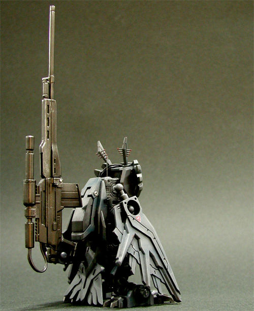 ■ ストーリー及び設定 遠距離支援用/索敵用の強化仕様。 ステルスボディと頭部複合センサーの拡張による大幅な索敵機能向上により、上空から敵の編成や状況を正確に把握する。 スナイピングモード時は全てのセンサーとカメラが連動して超遠距離からの正確な射撃をサポート。 ライフルは威力自体は申し分ないが、総弾数とリロードのバランスの悪さから主に敵指令機や主力機のコクピットや動力を狙い前衛をピンポイントでバックアップする。 敵の動きを混乱させつつ、スナイピングポイントを絞らせないスナイピング直後の前衛部隊による強襲作戦が成果を上げていた。 飛行モード時の攻撃は“可能”という程度。一応近距離戦用の装備も緊急用に装備されていた。 |