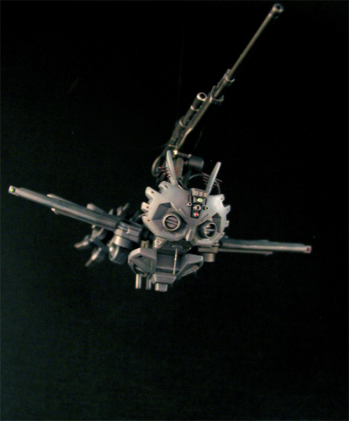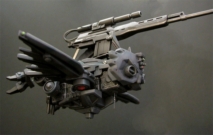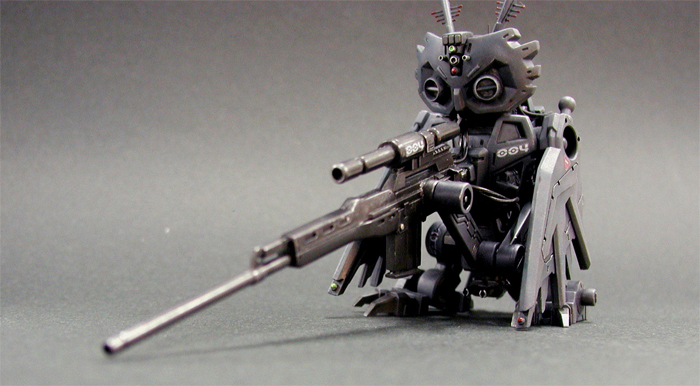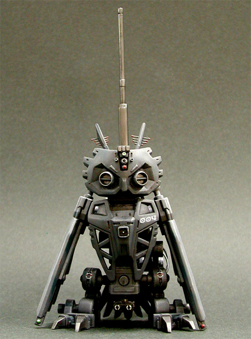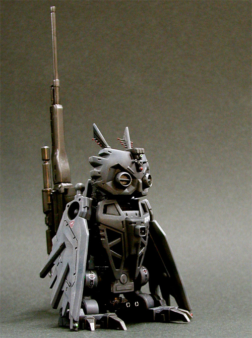 ■ 主催者KBコメント 面白いです!目にあたるセンサーパーツの使い方など、フクロウの雰囲気がすごくよく再現されていると感じます。夜間型(?)ならではのセンサーの使い方もGOOD。塗装はおとなしく纏まってますが、部分的に配置された赤がポイントカラーになってますね。羽根のエッジをシャープ(肉薄)に研いだらますますスケール感がUPしたかもしれませんよ。 |
