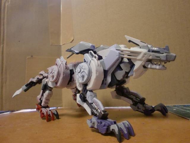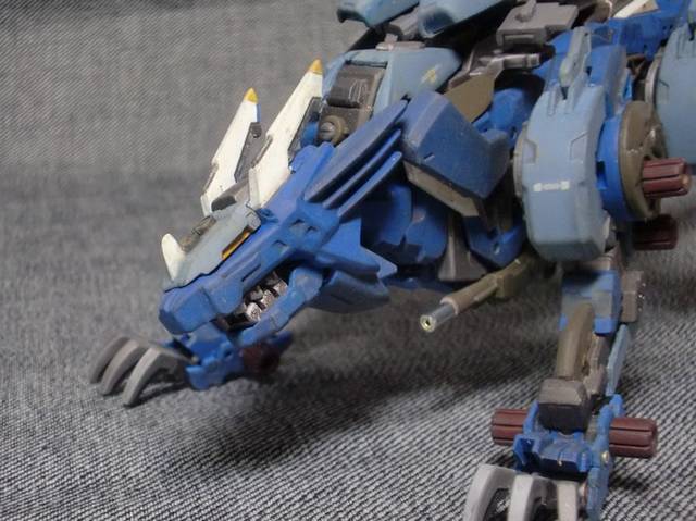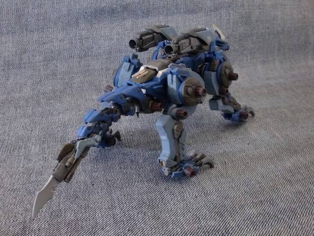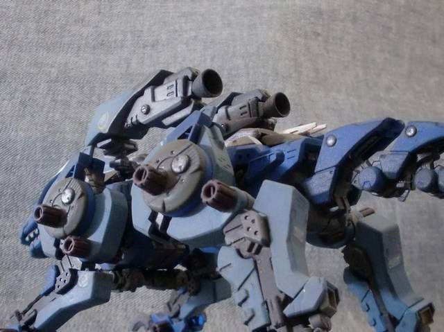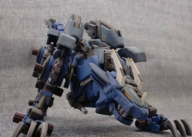 ■ 製作コメント HMMガンスナイパーのスネを前後逆にしてみたところ、非常にカッコ良かったのでナオミ仕様も動員して4脚型にしてみました。 頭部:レオブレイズの鬣にガンスナの顎とブレードアンテナを装着しプラ板とエポキシパテで形状変更。HMMコマンドウルフの銃座底面の先端を使って装甲式キャノピーにしました。 脚部:装甲・フレーム共に前後でラインが変わるように心がけました。爪は半田ごてを使って根本で曲げることで左右対称にしてみました。※脚の甲の可動化および膝の後ハメ加工に関して、展示会・オフ会・fg等で拝見したNMRさん製作のHMMガンスナイパーからアイデアを拝借させていただきました。この場を借りてNMRさんにお礼申し上げます。 その他:ガンスナのパーツを使いつつ頭から尾までラインに一貫性が出るようにパーツを選んで取り付けていきました。 ヒケ・エッジ処理などの基本工作にも腰を据えて取り組んでみました。 |