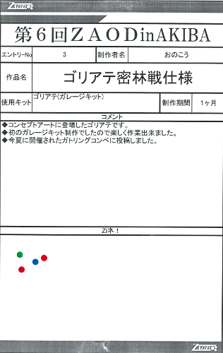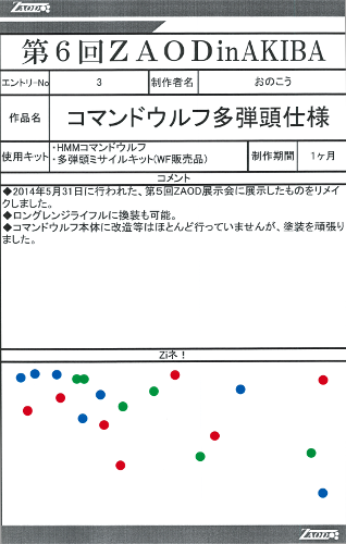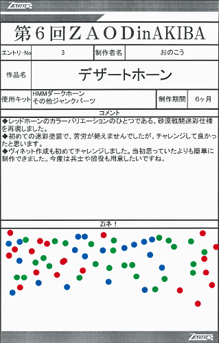 ◆作品 おのこうさんの展示作品です。 時間をかけて緻密に塗装された作品の数々! 細部まで拘った処理と塗り分けは必見! Thanks to everyone for all ◆プロフィールシート ◆エントリーシート ◆アンケートに寄せられたコメント コマンドウルフ多弾頭 ・塗装が綺麗。配色が好み デザートホーン ・デザートカラーが好きなので。砂漠迷彩は初めて見ましたがとてもかっこいいです! ・レッドホーン自体、重厚さがあって好きなゾイドなので砂漠の戦闘に特化したところがロマンがあって好き ・素晴らしい塗装!!(月並の感想ですが・・・)ドラマを感じました。