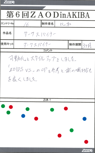 ◆作品 比和さんの展示作品です。 可動化したダークスパイナーを始めシンプルながらしっかりした改造をされている作品を出展されています。 Thanks to everyone for all ◆プロフィールシート ◆エントリーシート