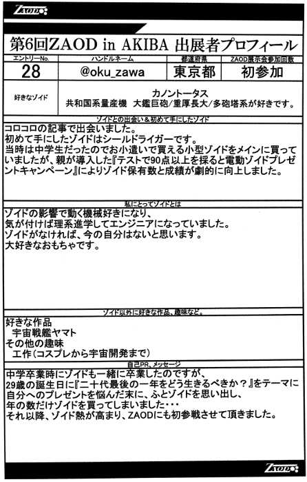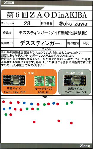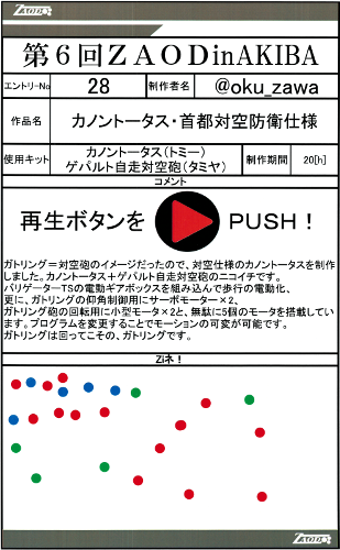 ◆作品 @oku_zawaさんの展示作品です。 ガトリングコンペにて初出のカノントータス首都防衛対空仕様の銃身回転ギミックは必見! RC仕様のデススティンガーも人気でしたね。 Thanks to everyone for all ◆プロフィールシート ◆エントリーシート ◆アンケートに寄せられたコメント カノントータス首都防衛仕様 ・ガトリングは回ってこそ ・動き回る点に引かれた ・実際に動くのがかっこよかった デススティンガー ・コントローラが面白そう ・ゾイドを無線で操縦できているようにしているから。 ・動くゾイドを作りたくなった。
