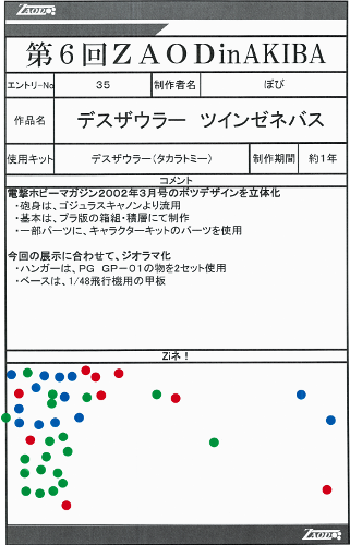 ◆作品 ぼびさんの展示作品です。 デスザウラーフリークが待ち望んだ大迫力のゼネバスキャノン装備型の立体化! ディスプレイ方法も素敵でした。 Thanks to everyone for all ◆プロフィールシート ◆エントリーシート ◆アンケートに寄せられたコメント デスザウラー・ツインゼネバス ・ゴジュラスキャノンとのバランスがステキ☆今にも出撃しそうな感じがたまらない ・シンプルかつ非常にかっこよく感じた。