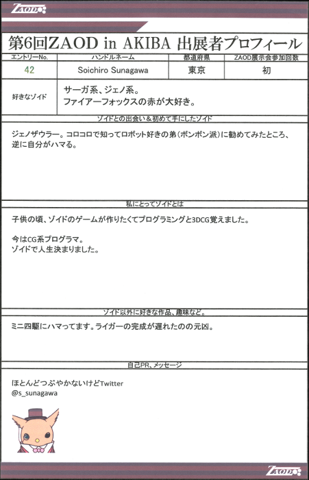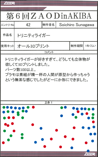◆作品 Soichiro Sunagawaさんの展示作品です。 時代の最先端を行く3Dプリンターで作成された立体作品です! ここまで精密にトリニティーライガーが立体化されていることに感動すら覚えます。 Thanks to everyone for all ◆プロフィールシート ◆エントリーシート ◆アンケートに寄せられたコメント トリニティーライガー ・3Dプリンタで作って純粋にスゴイ。今回見学に来た一番の目的 ・3Dプリンタで作成という新しいアイデアが素晴らしかったです。出来も良く感動しました。 ・出なければ作るというコンセプトが素敵でした。完成度も高く、そのまま発売してほしいくらいです。