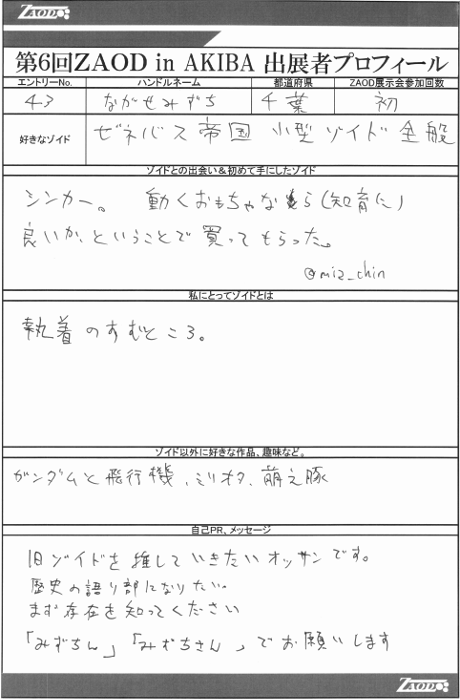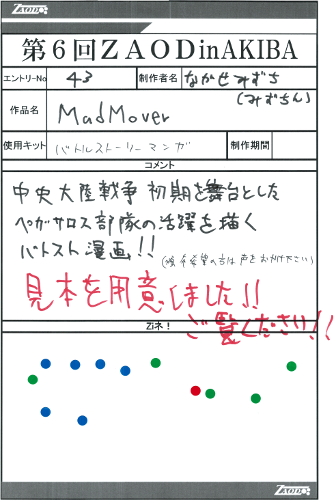 ◆作品 ながせみずちさんの展示作品です。 ペガサロスが主役のミリタリー色の濃いゾイド戦記物を出展されていました。 (作品の出展方法について配慮しきれなかったことをお詫びいたします。) Thanks to everyone for all ◆プロフィールシート ◆エントリーシート ◆アンケートに寄せられたコメント Mad Mover ・ペガサロスに焦点とは渋い・・!(新世紀ゾイド世代からなので