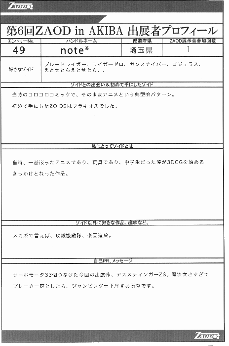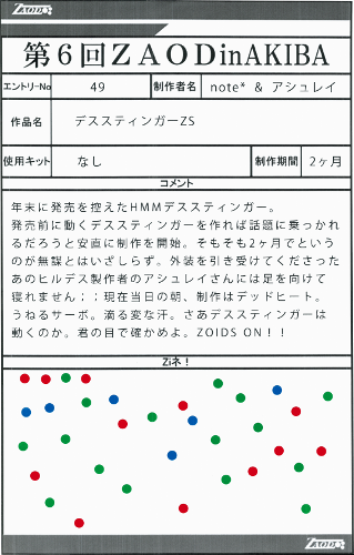 ◆作品 note*さんの展示作品です。 デススティンガーがうねうね動くよ! 紙+メカニクスという新しい試みを見せてもらいました。 Thanks to everyone for all ◆プロフィールシート ◆エントリーシート ◆アンケートに寄せられたコメント デススティンガーZS ・様々な技術の融合。