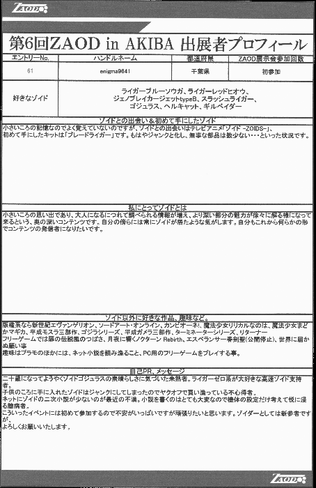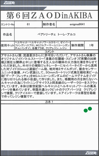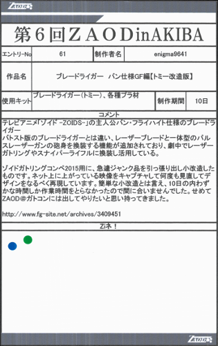 ◆作品 enigma9641さんの展示作品です。 妄想戦記に登場したタカラトミーゾイドのバリエーション機を再現された作品を多数出品いただきました。 次回は是非完成状態で出品いただきたい! Thanks to everyone for all ◆プロフィールシート ◆エントリーシート ◆アンケートに寄せられたコメント ジェノブレーカジェットtype・B ・好きな機体なのでうれしい
