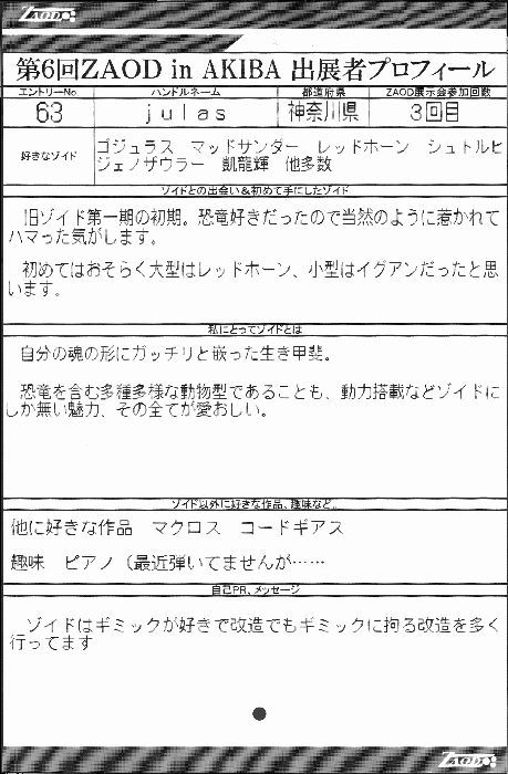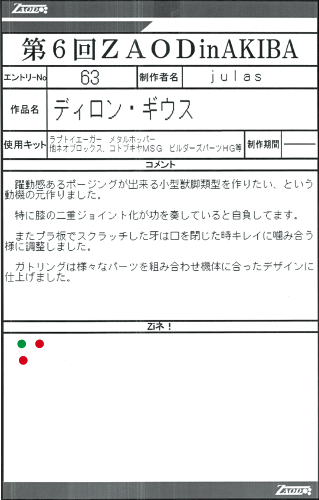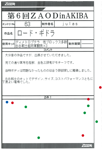 ◆作品 julasさんの展示作品です。 オリジナルギミックのゼンマイ可動ゾイドを作るのが得意なjulasさんですが今回はちょっと違うアプローチの作品を出展されています。 某金色の宇宙大怪獣型モチーフはZAODでは初出で新鮮ですね! Thanks to everyone for all ◆プロフィールシート ◆エントリーシート ◆アンケートに寄せられたコメント ロードギドラ ・自分もやった!!