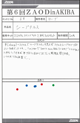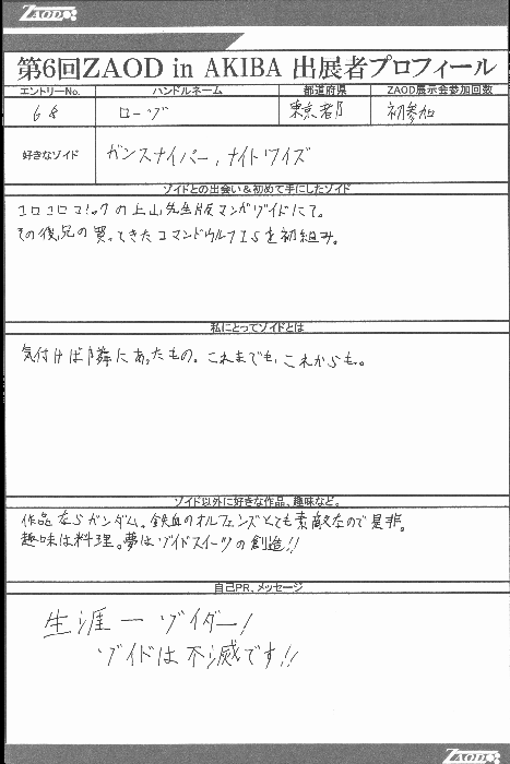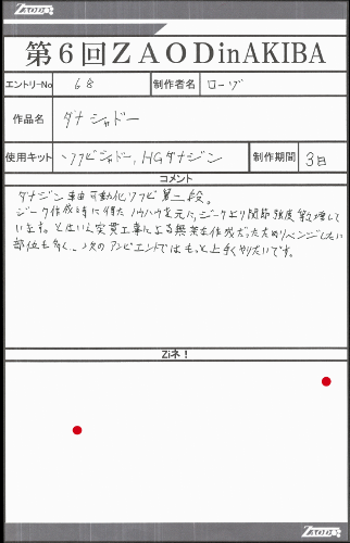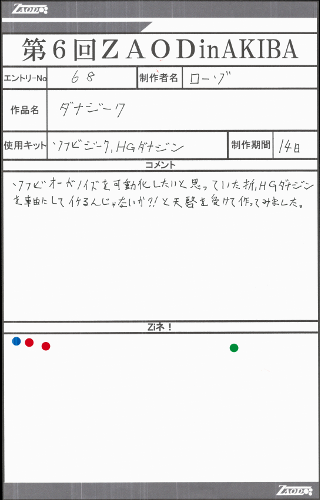 ◆作品 ローゾさんの展示作品です。 ガンプラをフレームとした、フル可動ジークとシャドー、 そして参加者に強烈なインパクトを残したワイズマンと柔軟な発想には驚かされました。 Thanks to everyone for all ◆プロフィールシート ◆エントリーシート ◆アンケートに寄せられたコメント ダナジーク ・かわいかったです