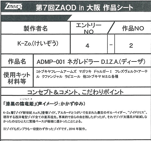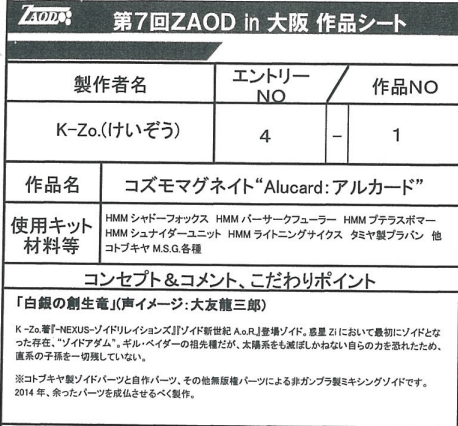 ◆作品 K-Zo.さんの展示作品です。 ご自身のオリジナルストーリーに登場するゾイドを立体化されています。 竜型ゾイドの白と黒のコントラストが印象的でした。 Thanks to everyone for all ◆プロフィールシート ◆エントリーシート ◆アンケートに寄せられたコメント 【コズモマグネイドarcard】 ・誰が見てもかっこいいと思うから ・ドラゴンが好きでかっこよかったので。