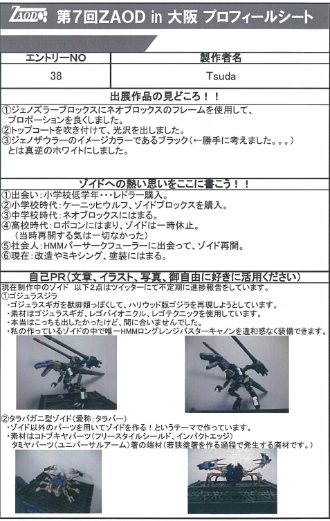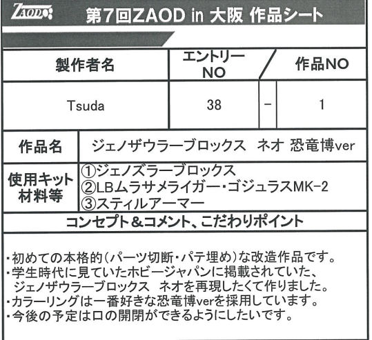 ◆作品 Tsudaさんの展示作品です。 シンプルにみえていやいやどうして丁寧な工作をされています。 Thanks to everyone for all ◆プロフィールシート ◆エントリーシート ◆アンケートに寄せられたコメント ジェノザウラーブロックスネオ恐竜博ver ・シンプルながら丁寧な作品