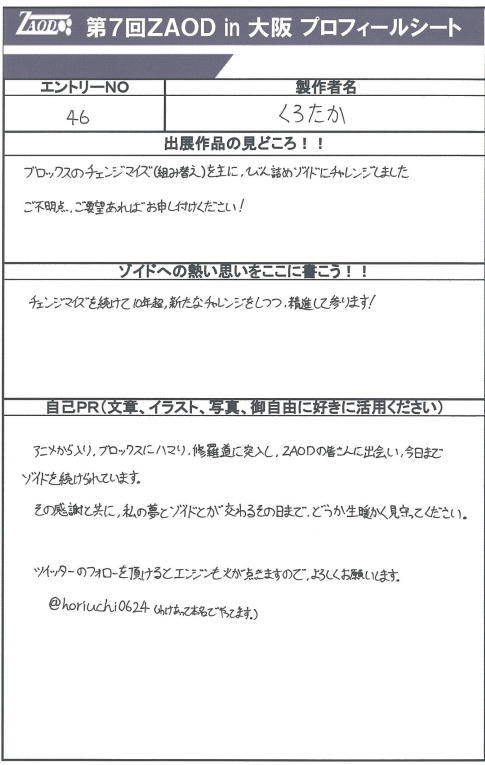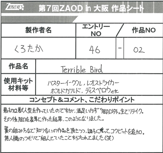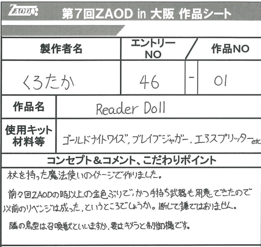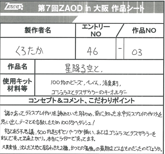 ◆作品 くろたかさんの展示作品です。 ZAOD名物ブロックス職人。 瓶詰めデスザウラーもユニーク! Thanks to everyone for all ◆プロフィールシート ◆エントリーシート ◆アンケートに寄せられたコメント 星降る空と ・見てて涼やかでした。 ・コンパクトでかわいらしく、きれい ・瓶に入ったデスザウラーとゴジュラスはまるで神話の挿絵を見ているようだった。