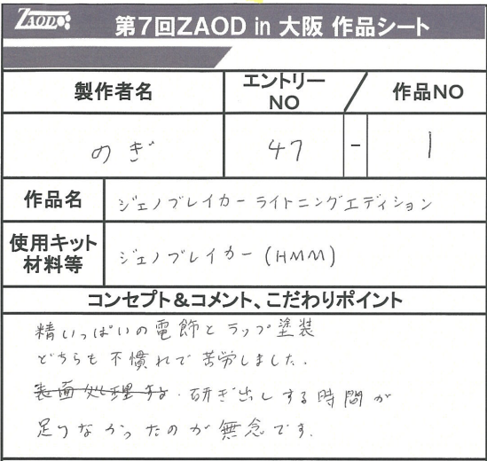 ◆作品 のぎさんの展示作品です。 ジェノブレイカーのフル電飾作品はラップ塗装と相まってよく目を引きました。 Thanks to everyone for all ◆プロフィールシート ◆エントリーシート ◆アンケートに寄せられたコメント ジェノブレイカーライトニングエディション ・電飾が良く目立っていた